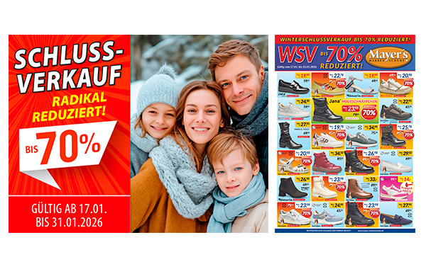 Ab dem 17. Januar 2026 startet bei Mayer’s Markenschuhe in der Gerberpassage der Winterschlussverkauf. Freuen Sie sich auf attraktive Rabatte von bis zu 70 % auf ausgewählte Marken und Modelle.